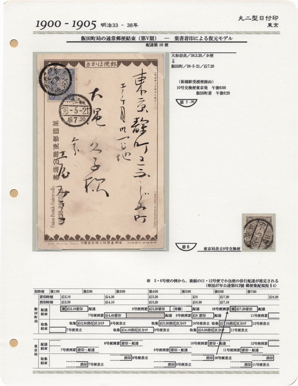 本池本に掲載された第V期の伝送表を見ると、飯田町局=東京局間は30分(実際は29分ですが日付印の表示は30分差になります。)ですので、全12便の逓送便の到着時刻は